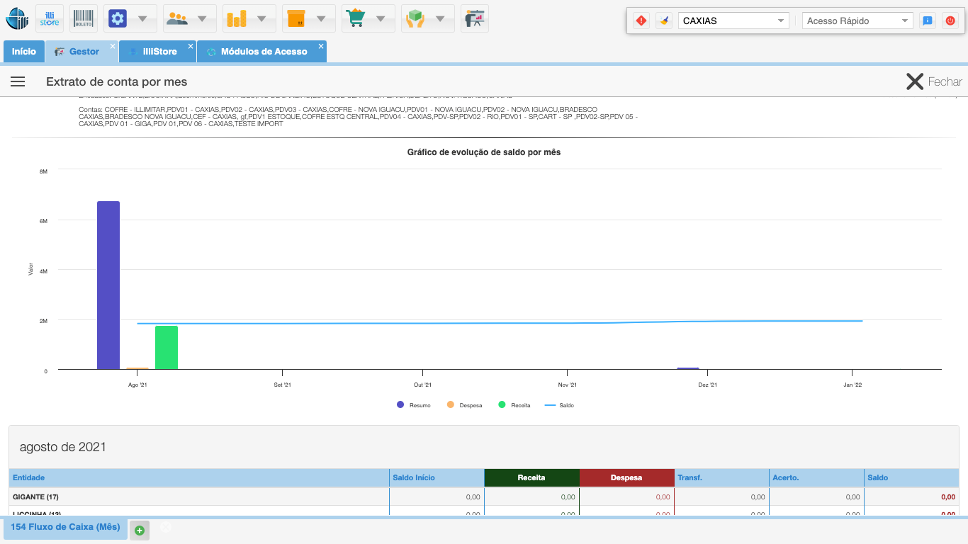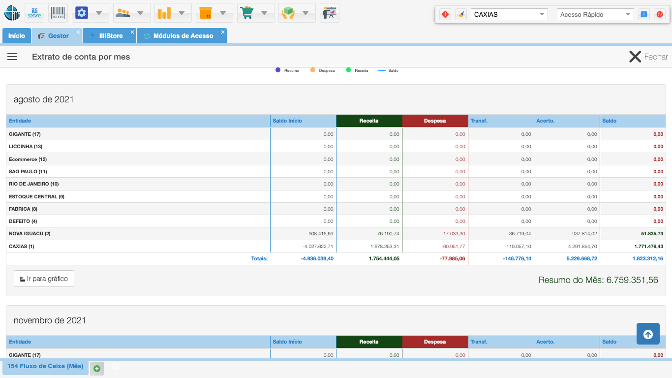 Relatório para analise de entradas e saída em conta com gráfico e resumo por período, agrupado por mês