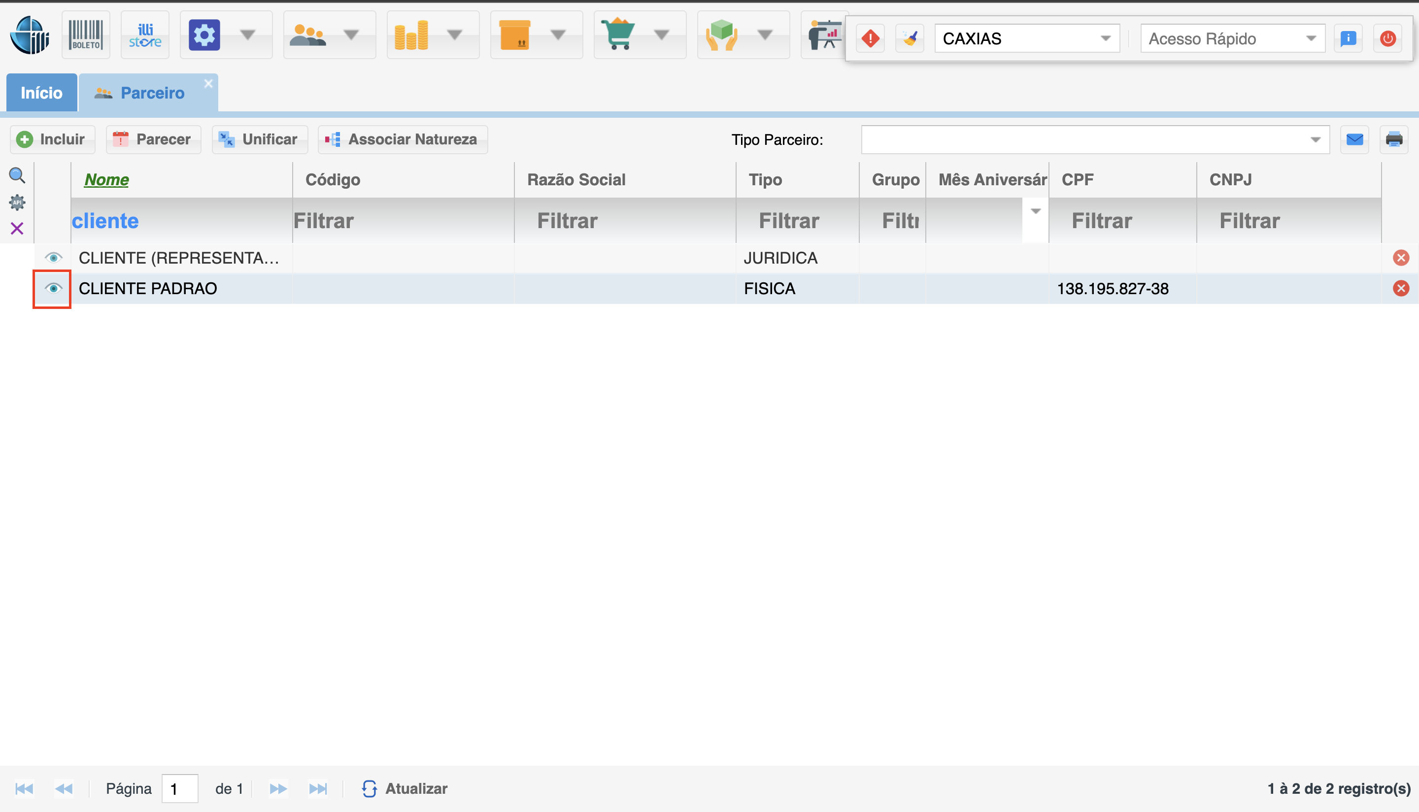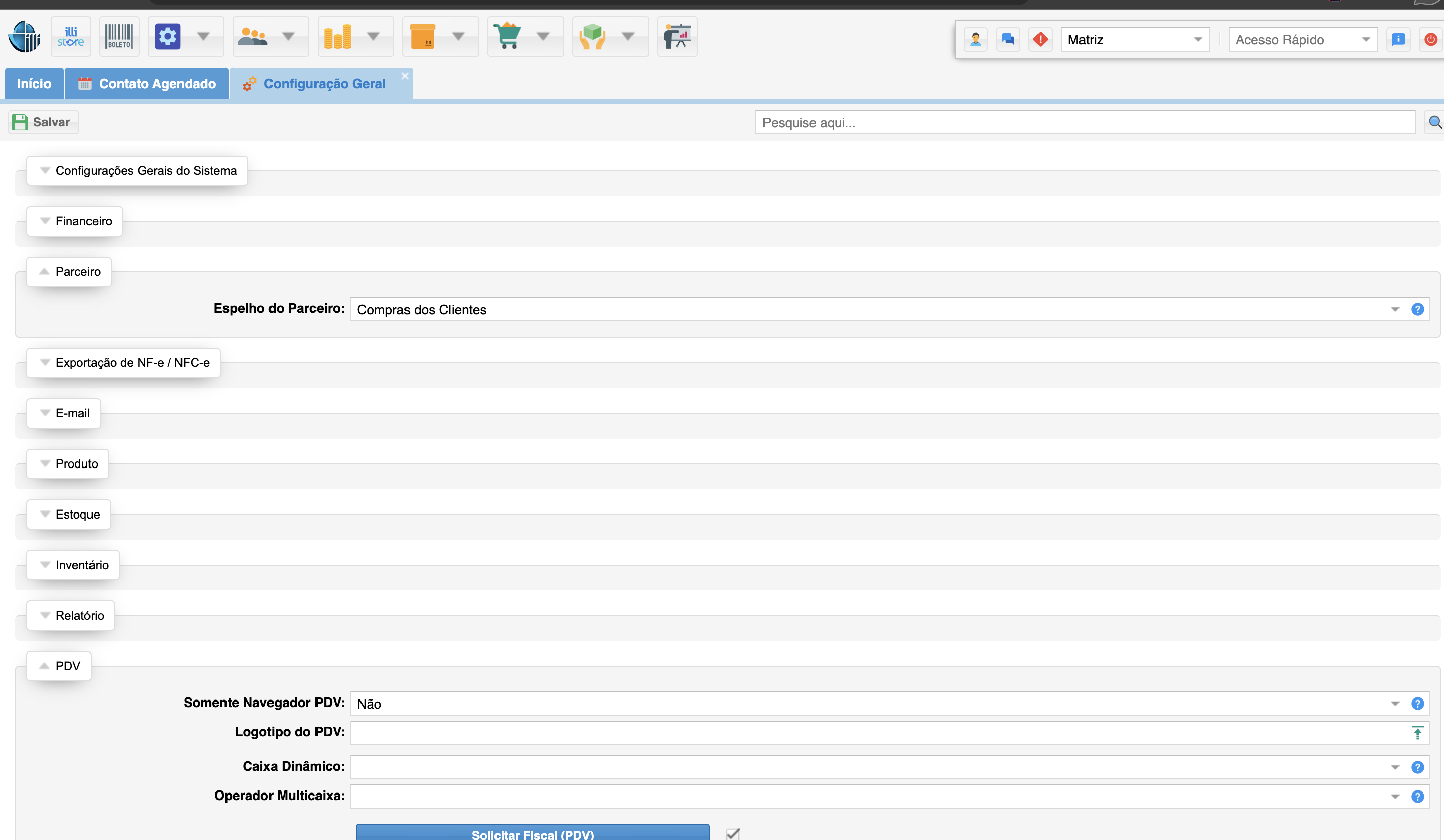 Importante: Para habilitar essa funcionalidade navegue por: sistema → configuração geral → parceiro, em “espelho do parceiro" selecione a opção “compras do cliente" e clique no botão "salvar”, localizado no lado superior esquerdo da página.