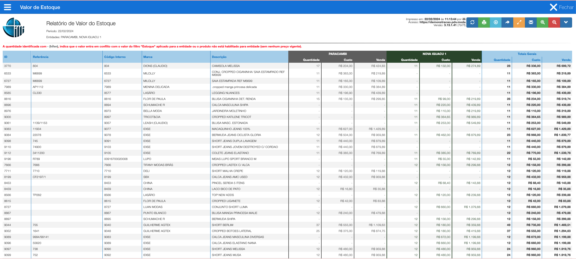 Relatório Exibe Informações de totais de Quantidade, Preço de Custo, Preço de venda do estoque das entidades selecionadas